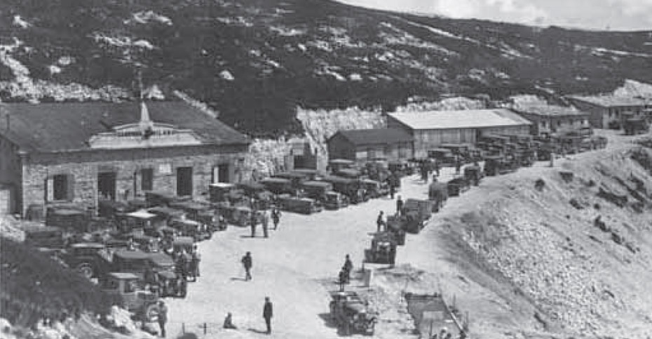 Didascalia: L'afflusso delle truppe alla Caserma Milano sul Grappa. Ho l'impressione che questa immagine sia stata fatte a guerra finita. I veicoli che si vedono hanno un carattere più civile che militare. origine : libro Baluardo Grappa S. 30 |